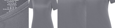 100% polyester wicking knit with true hue technology; True hue technology prevents dye migration; Wicks moiusture away from the body; Ladies' fit; Updated fit has longer length and bigger chest for added comfort; Tear away label; V-neck collar; Raglan sleeves;