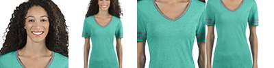 4.5 oz.; 50% preshrunk polyester, 37% cotton), 13% rayon jersey; Soft, lightweight jersey with advanced moisture management performance; Made with sustainably sourced USA grown cotton; Contrast collar and varsity striping on sleeves for a stylish, sporty look; 1x1 rib collar with mitered v-neck construction; Classic ladies’ styling with a feminine neckline, sleeves and fit; Side-seamed and slightly contoured for a flattering fit; Tear away label; Shoulder-to-shoulder taping; Two-needle hemmed sleeves and bottom; Jerzees styles are manufactured using sustainable protocols which are measured and reported annually by Fruit of the Loom, Inc.; Jerzees styles are manufactured with the commitment to enriching lives for people and communities which is measured and reported annually by Fruit of the Loom, Inc.;