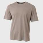 100% polyester heather tee, 4.2 oz. per square yard; Odor resistant and stain release fabric for easy care; Moisture management for all season comfort; Neck seam cover-stitched for extra durability; Tag-free neck;