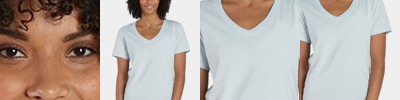 4.5 oz., 60% combed ringspun cotton/ 40% polyester fine jersey; 4.5 oz., 100% combed ringspun cotton jersey; Easytear™ label; contrasting topstitched self-fabric sleeve stripes; double-needle hemmed sleeves and rounded bottom; sideseam construction; fit: ladies' modern - semi-fitted ; taped neck; v-notch with raw serge finished edge;